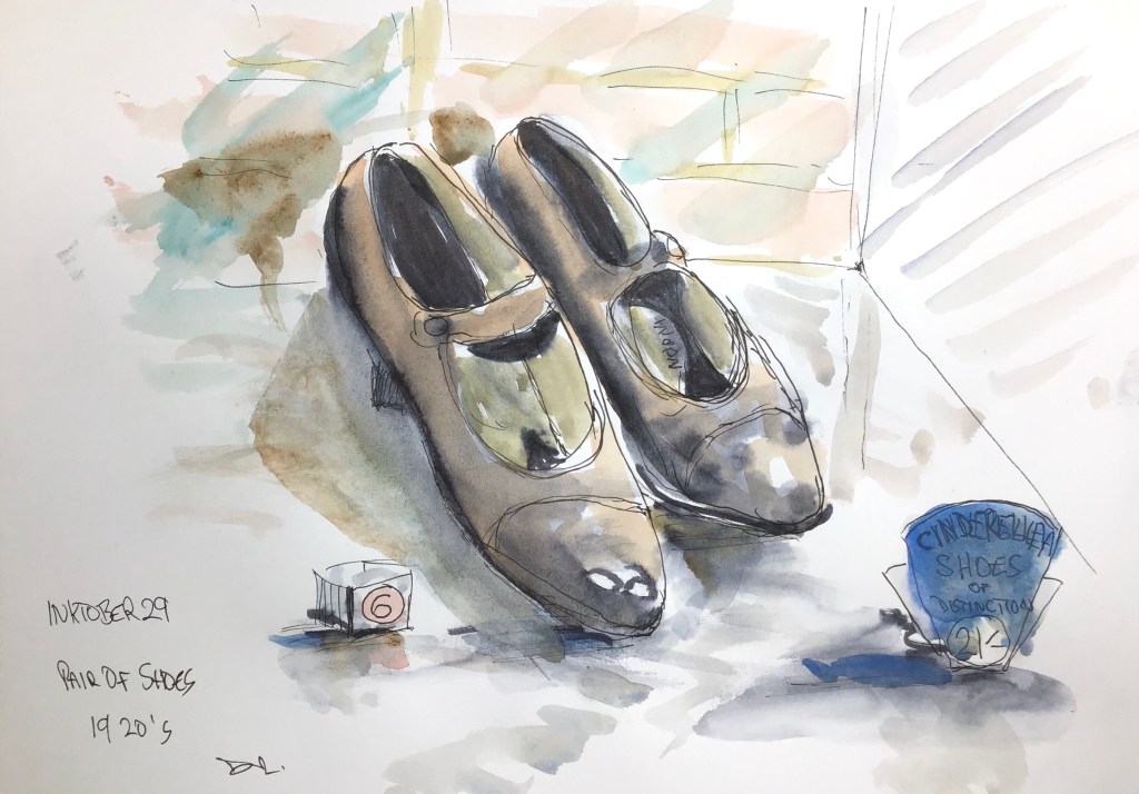 Inktober 29 SHOES. I didn’t have a clue what to do for this prompt but I was in Poole Museum this morning as it was too wet to do any painting outside on the quay. One of the exhibits from Poole was this pair of shoes from the 1920’s. I don’t think there is anything special about them apart fro the fact they have survived for nearly 100 years but the opportunity was too good to miss.