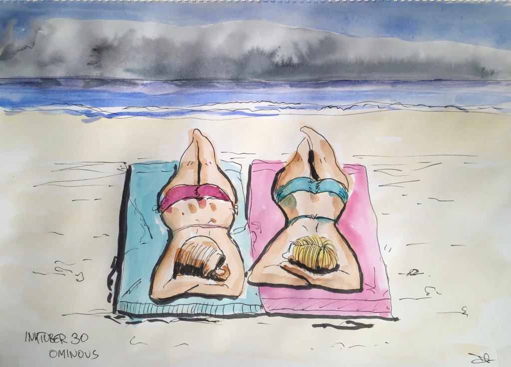 Inktober 30 OMINOUS These two young ladies with the strange perspective haven’t seen the ominous clouds building up out to sea which will bring there day on the beach to an end.