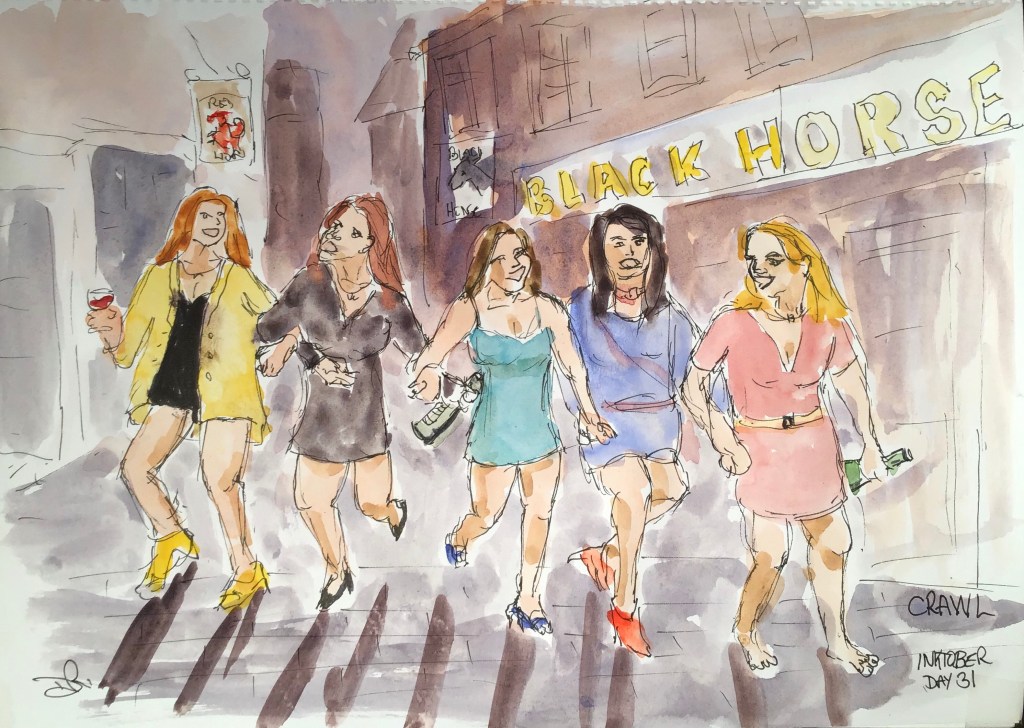 Last day of Inktober today and the word is CRAWL. I am not sure I could do a pub crawl anymore, after the first couple I would need to lie down in a darkened room. These girls don’t have a problem and are clearly having a great time. I can’t help thinking it will end in tears but maybe that’s all part of the fun. Inktober has been a great challenge and I have enjoyed coming up with new ideas every day, I suppose I will have to do some “proper” art now.
