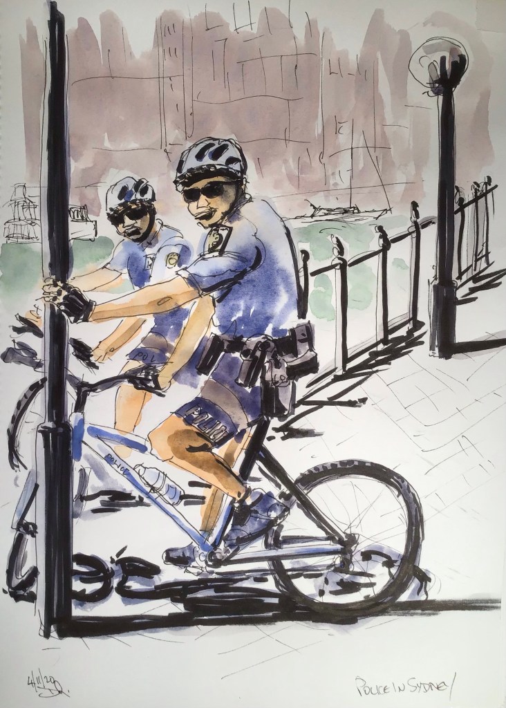 When we were in Sydney in 2011 I photographed these two cycling policeman, they were happy to stop and chat and to pose for the photo. It seems a little incongruous that they deem it necessary to carry guns on bikes and I am glad our own police haven’t gone down this road.