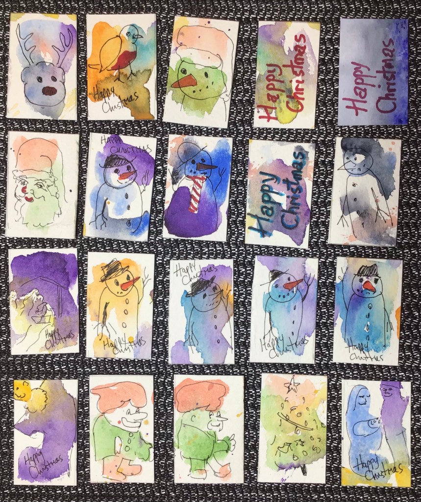 I made some Christmas labels today using some heavy watercolour paper. I didn’t plan ahead, just put some random washes down and added some little drawings. A very happy and safe Christmas to you all.