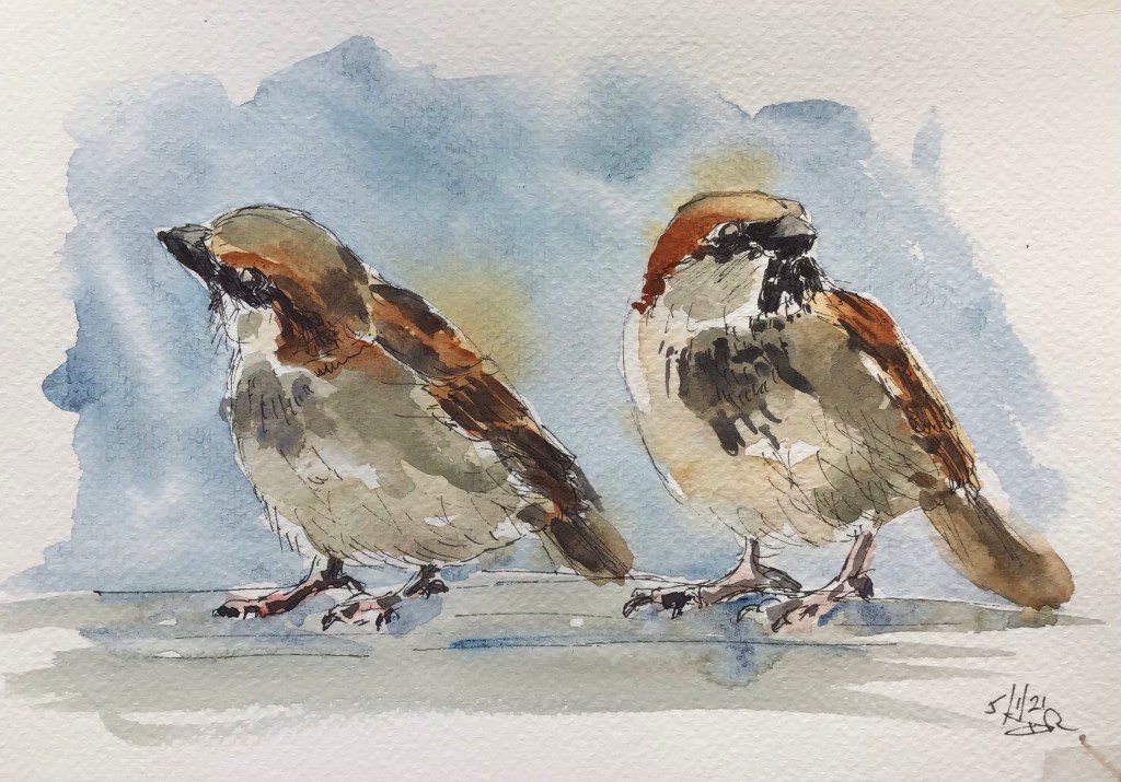 This weeks challenge from Purely watercolour features a couple of sparrows. When we lived in London sparrows were everywhere and came to the garden in large chattering groups. Here in Dorset they are fairly rare and our bird feeders are visited by blue tits, great tits, coal tits, long tailed tits, nuthatches robins and dunnocks. A lot more colourful but I miss the sparrows. Perhaps there is a way of attracting them to the garden, I will see what I can find out.