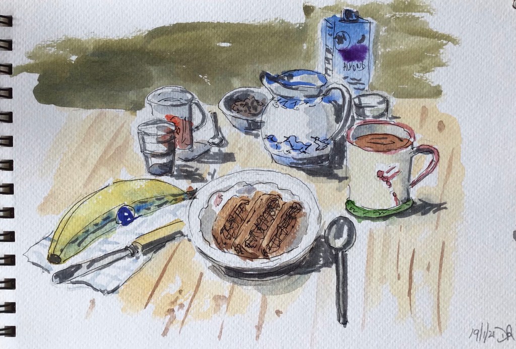 Poole and East Dorset Art Society are setting regular challenges for members. This one was to create a picture of beakfast items. The tutorial used pastel and watercolour but I chose to sketch this morning’s breakfast in pen and wash.