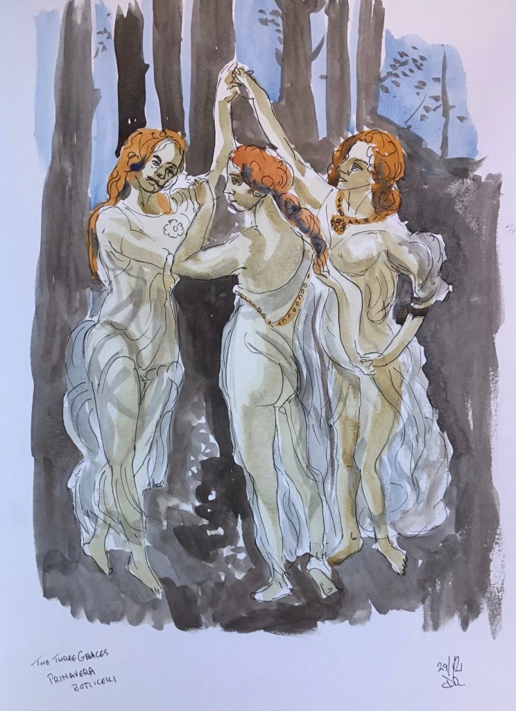 When I was a child we used to have family jigsaw puzzles, one of them was Primavera by Botticelli and it has since been one of my favourite classical paintings. This is my pen and wash version of the three graces from Primavera.