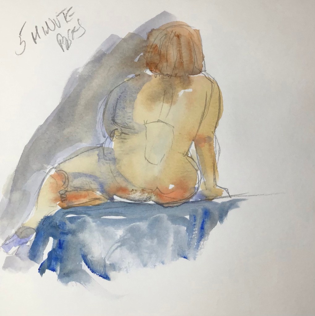We had a plus size model in our figure drawing challenge today with more poses for a Sunday. We had 4 one minute poses, 4 two minute poses and finally one five minute pose, I couldn’t fit her all on one page.! As usual I added some splashes of colour at the end.