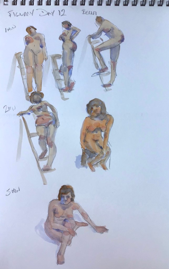 Figuary day 12. Today’s poses were all about foreshortening which is notoriously difficult to draw. The brain refuses to accept that sometimes the head can look bigger than the body or a knee cap is larger than a shoulder so you have to switch off the part of the brain that names things and just draw shapes, difficult to do within the allotted times!