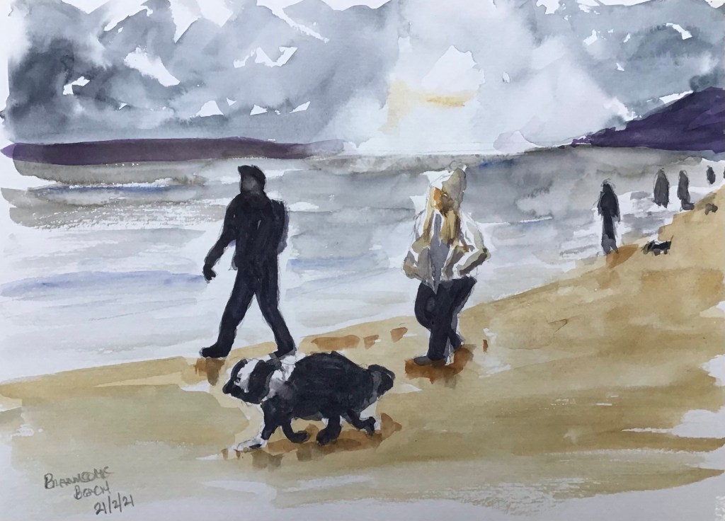 Last Tuesday the removal crew were loading the first van so I managed to get away for an hour with the dogs for a walk along the beach. The light was super so I took some photos and finally got around to do a quick watercolour this morning.