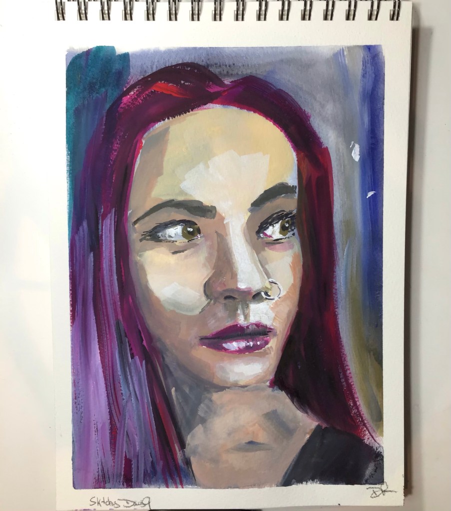 I had another go with gouache for today’s portrait session. I thought I had better not write it off without giving it a chance. I didn’t have all the colours so I used some opaque watercolour as well. I don’t particularly like the Matt finish when it dries or the way colours blend. The portrait was fun to do though.