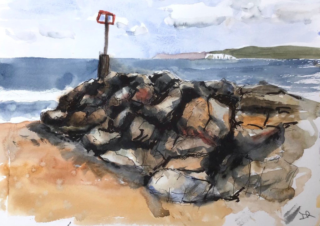 Another watercolour sketch from Hengistbury Head yesterday. This rock groyne gave me shelter from the cold wind as well as being a good subject for a pen and wash painting.