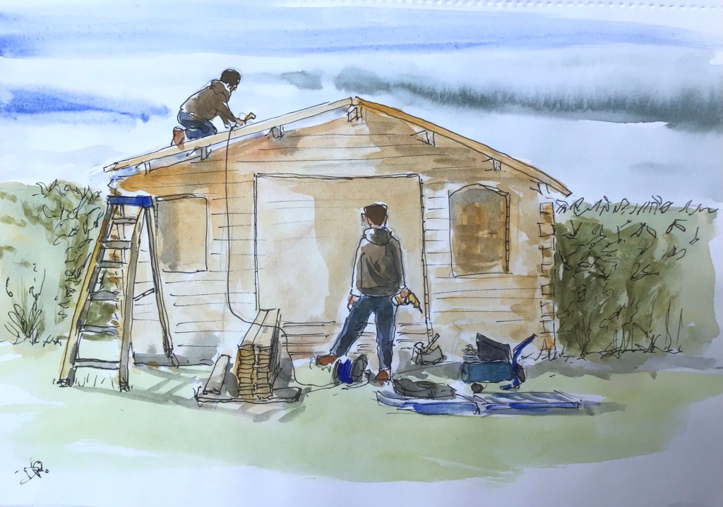Our new studio was delivered on Tuesday and the crew came to build it on Wednesday. The day started bright and sunny but went downhill from around midday with heavy showers and hailstones. Luckily they managed to get the roof finished before it rained. All we need now is electricity and a coat of paint including varnishing the floor with three coats of varnish, I wanted it so I can paint more so I suppose I can’t complain!