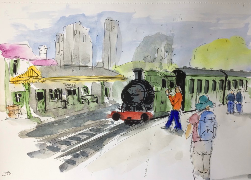 Corfe Castle Station ticks all the boxes for me, the station, the castle, steam trains and people. What more could you want in a painting apart from a little more accuracy and attention to detail! This started out as a trial layout for a larger painting but I got carried away.