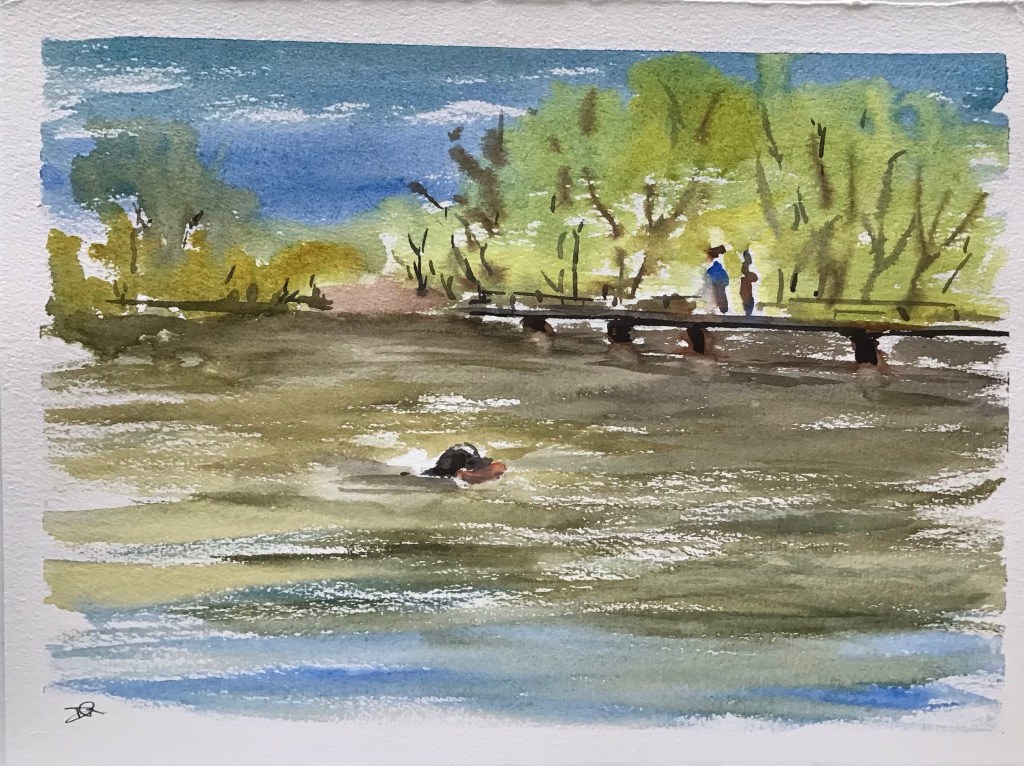 The Ford at Morton crosses the river Frome and is a great place to sit and paint. Walkers cross the bridge while dogs play in the river, there was even a horse and rider while we sat there but that picture will have to wait for another day. I have fond memories of driving my Land Rover through it some years ago, I doubt that my current car, a Nissan Qashqai, would make it! This black retriever was fetching dummies in a great display of water retrieving.