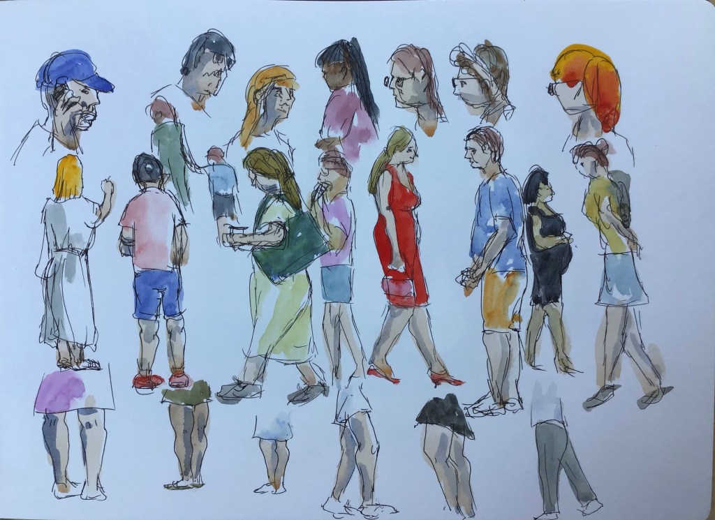 Sitting at the art market yesterday I kept busy by sketching the people walking past. It wasn’t easy to capture the whole figure so I concentrated on legs! It helped to pass the time!