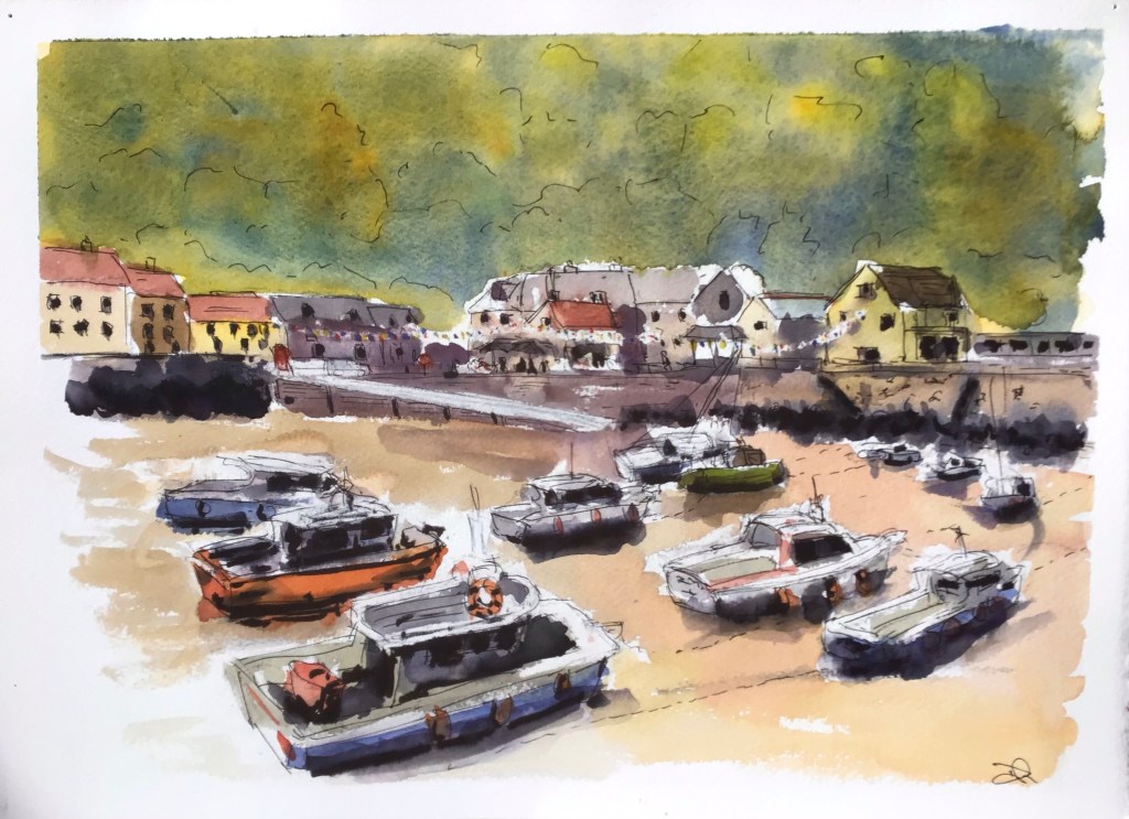 I didn’t think I would enjoy visiting Menehead very much expecting holiday camps and amusement arcades. Well they are there for those that want them but the town was really rather pleasant and the old harbour an unexpected bonus. We spent a couple of hours here while I painted, it has a great atmosphere and lovely views with the wooded head rising up behind the harbour.