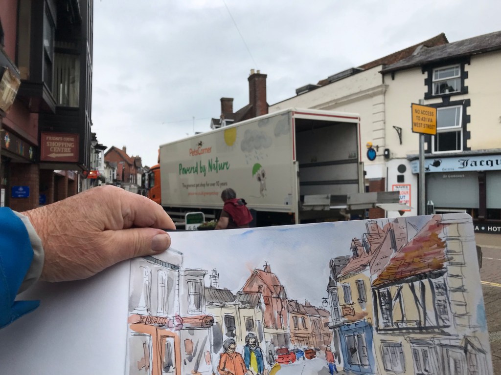 In Ringwood this morning with the Poole & Bournemouth urban sketchers group. The early rain cleared so we had a couple of hours of dry weather. I sketched the high street but when I came to take the photo of sketch plus scene, as required by urban sketchers, a large lorry stopped to make a delivery and it started to rain!