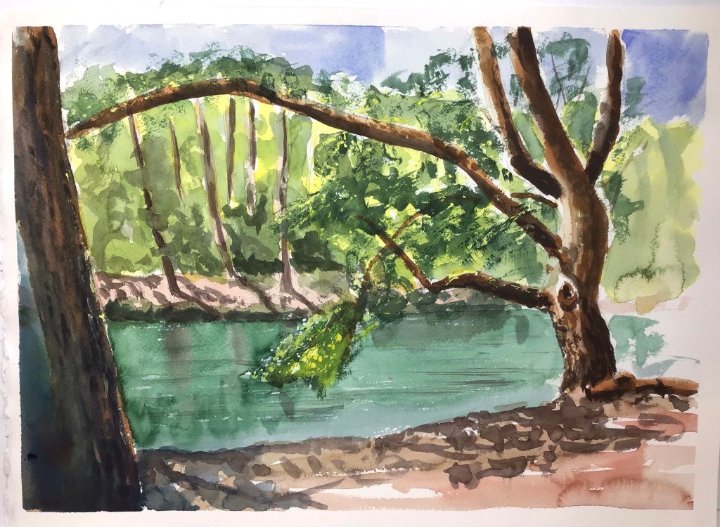 Today’s outing with Broadstone Art Society took us to the Blue Poole near Wareham, Dorset. Once used to extract clay for Poole pottery it is now a delightful lake surrounded by pine woods, perfect for a visit on a really hot day. Having finished a mediocre watercolour I sketched our president Dennis and his daughter as he painted the pool in oils. Dennis is in his 90’s and still joins us to. Paint outside whenever he can, he is always cheerful and very inspirational. A very nice chap!