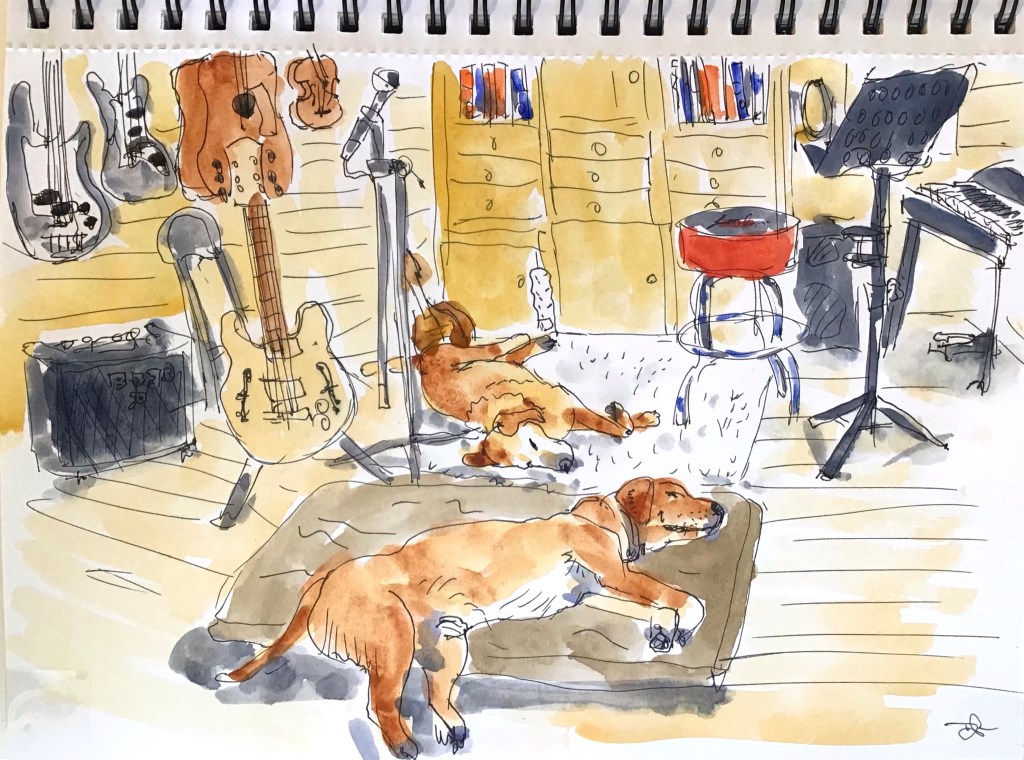 My garden studio was designed for art and music but seems to have been taken over by the dogs as their new favourite place. It faces North so stays cool when it’s hot outside. I do have a corner left for my drawing desk and easel so at least I could capture the scene.