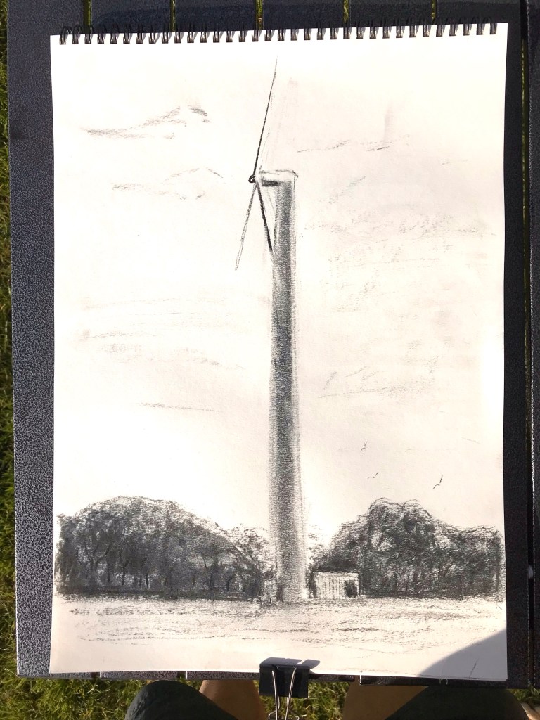We are staying on a caravan site near Barnstaple in Devon that looks out on to several wind turbines. I wanted to try to convey how massive they are so I chose charcoal to illustrate how they tower over the trees. This one is around 75metres to the turbine plus the length of a blade. Nelsons column is 52 metres.