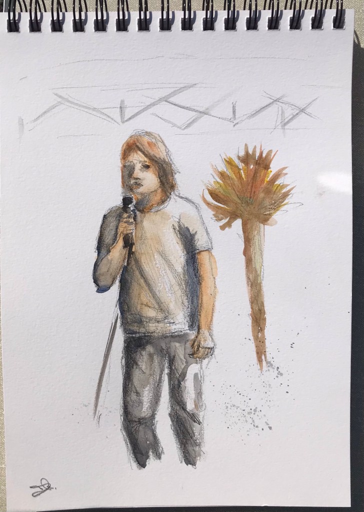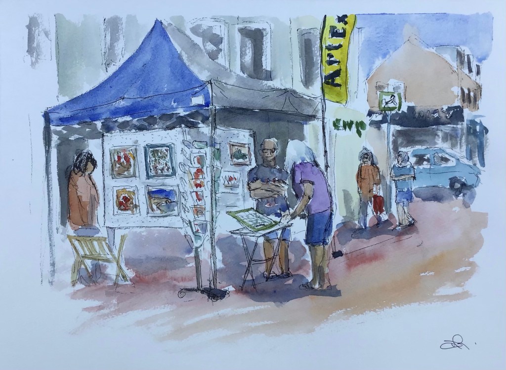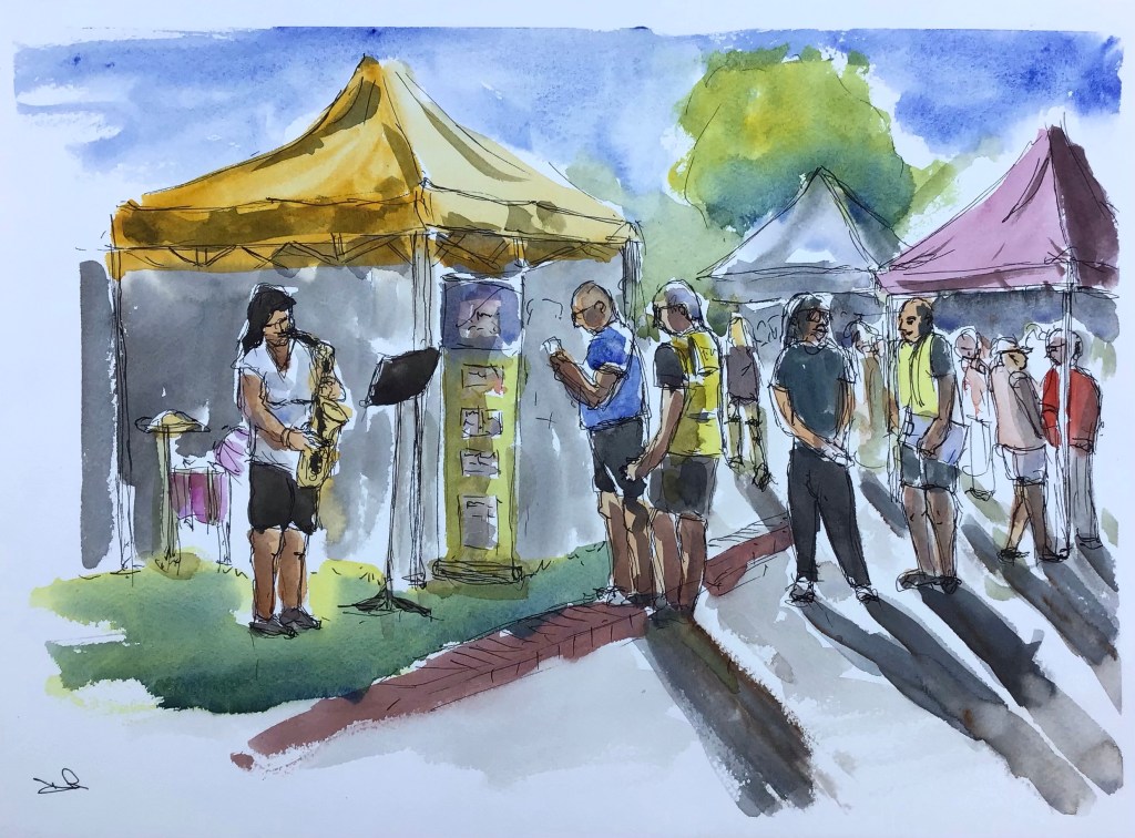 Broadstone art society had a pop up exhibition at Broadstone Musical Market today. I was out sketching some of the colourful stalls and a couple of the performers. I didn’t get the name of the talented girl on the sax, the singer was Isaac Slade who’s effortless performance was one of the highlights of a great day.