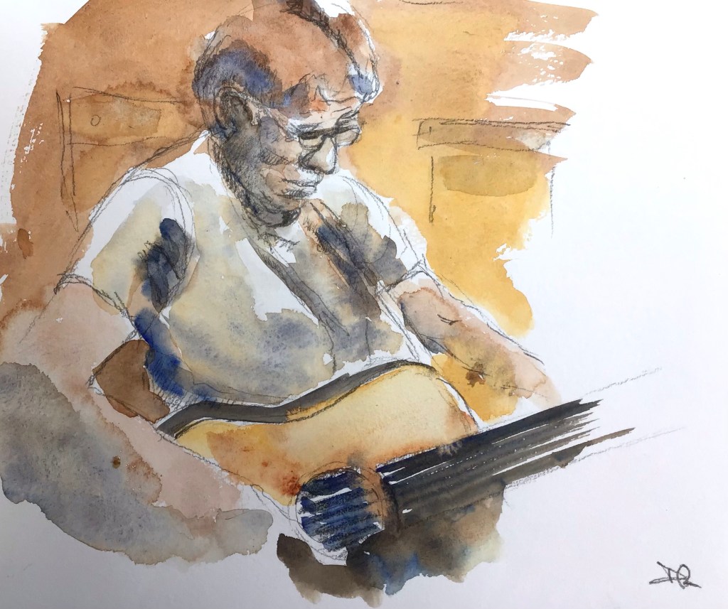 I have been thinking about how to make my painting more interesting and about style and composition. I read a book by the watercolour artist Hazel Sloane who said you should use a subject to create a painting and not just copy what is in front of you. I used a photo of guitarist friend Steve and interpreted it rather than producing a straight copy. I am not disappointed with the result although I am not sure he will recognise himself. However I have also read that likeness in a portrait is not important so that’s ok then!