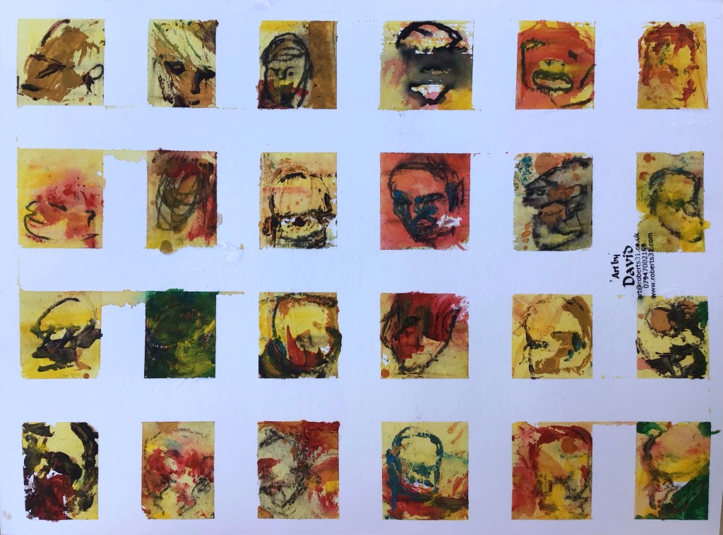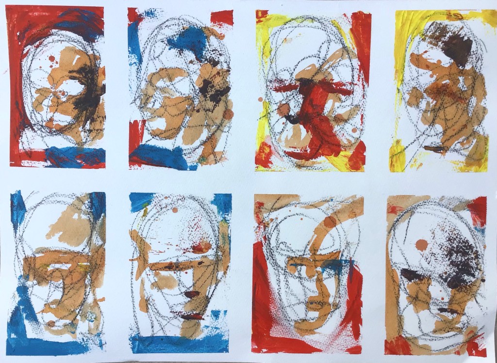 Our session at Broadstone art this morning was all about Not Painting! Using unconventional methods of applying paint, ink and pencil to create different marks. Our tutor Margarete showed us some of the techniques she uses before we all had a play. I find totally abstract work difficult so I decided to draw ovals with my left hand and try to discover heads in them. I really enjoyed the process and am quite happy with the results.