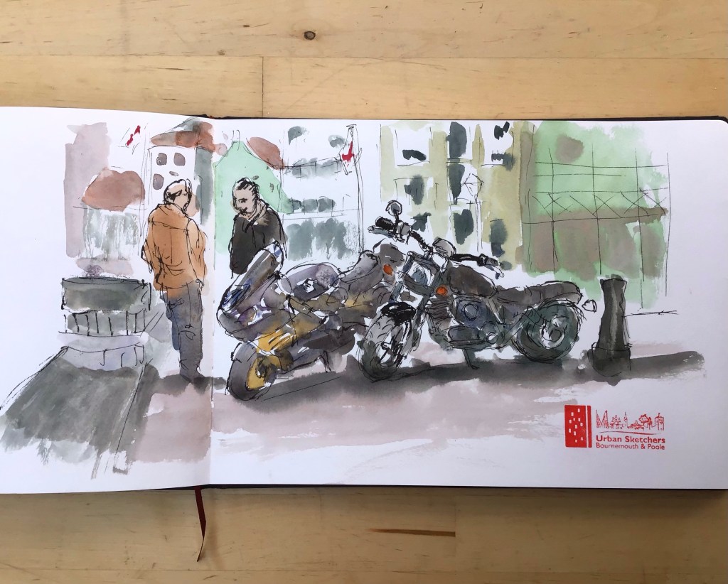 Met with Bournemouth and Poole urban sketchers on Poole Quay this morning. It was cold but bearable in the sunshine. These two bikers attracted my attention although one of them rode away before I finished! Do you like the new group stamp? First time it has been used, thanks to Doreen for designing and getting it made.