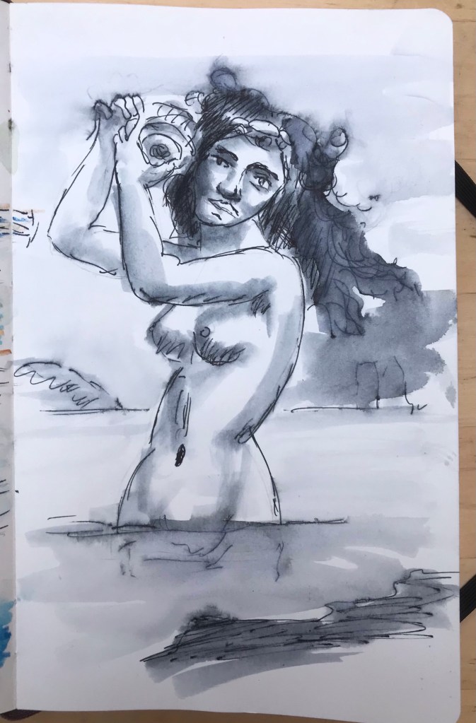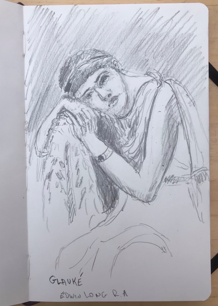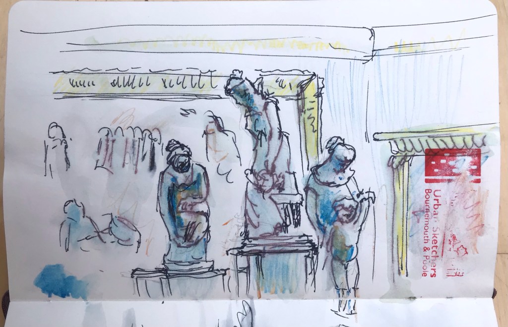 Out with Bournemouth and Poole urban sketchers at the Russel Cotes museum this morning. We had a good turnout with over a dozen sketchers. The museum was very festive with carols played on the piano and staff dressed in Victorian costumes. Watercolour isn’t allowed in the museum so I used a pen and water brush to create some tone on one and pencil on another.