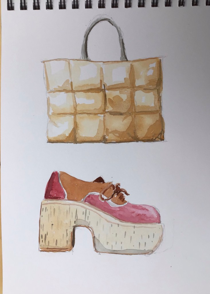 Ginny bought me a book about fashion illustration for Christmas. It’s fascinating to see a different approach to drawing figures that concentrates on clothing and accessories. Here are a couple of the exercises from the book that starts with shoes and bags.