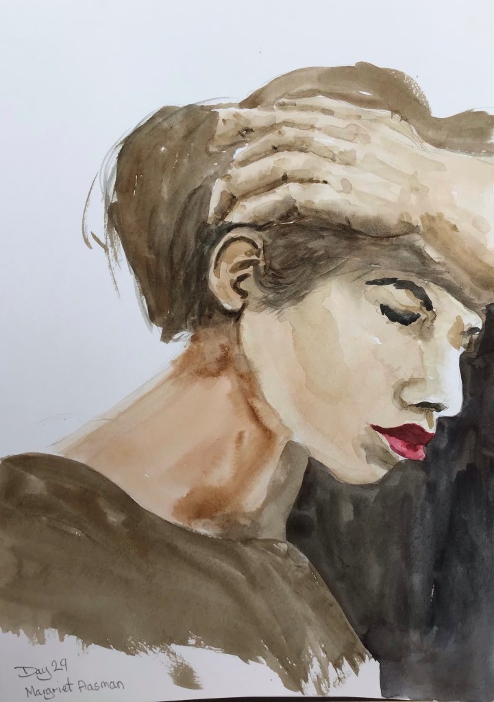 Day 29 of the Sktchy 30faces in30 days challenge with Margriet Aasman. Margriet used toned paper, wash and cross hatching with a pen. I chose to do a straight watercolour but try to keep the dark mood of the original.