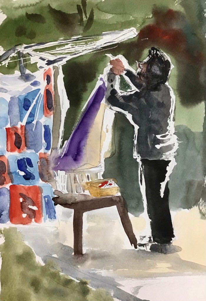 We’ve had some lovely sunny days over the weekend so Ginny decided to wash the grandchildren’s quilt covers. Hanging them out in the sunshine made a great picture which I couldn’t wait to paint.