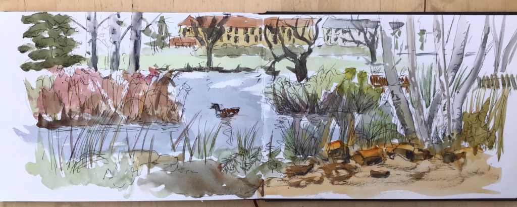 We met in Poole Park for today’s Poole art society meeting. I was taking a bit of a chance organising an outside event in February and it was extremely windy with rain in the air but we managed to do some sketching in a sheltered spot before retreating to the cafe for tea and cake.
