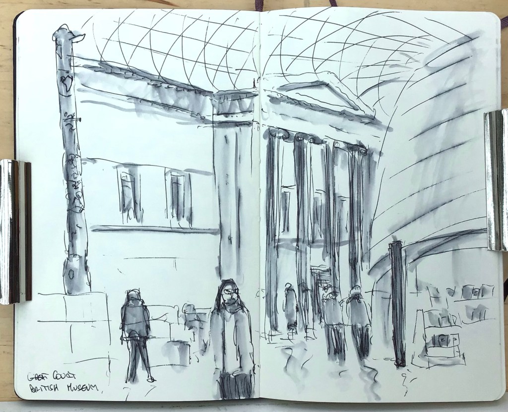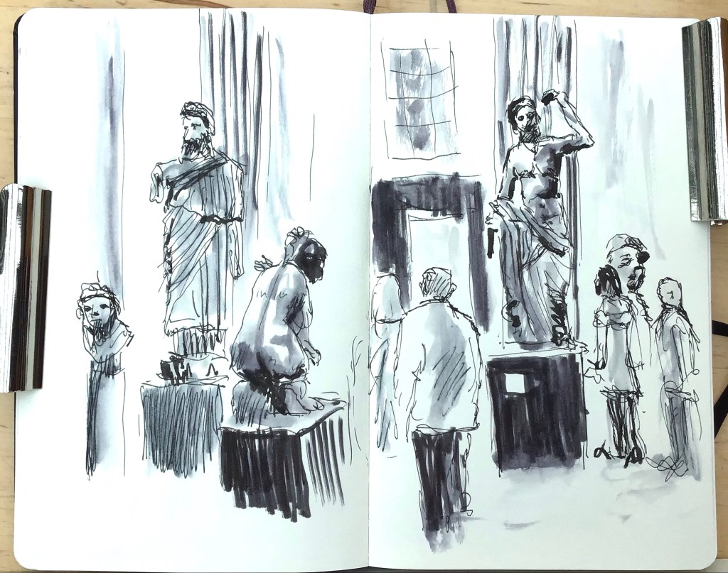 I had a day in London yesterday visiting the British Museum and the National Gallery. I had planned to go to the V&A but it was closed. The British Museum has some wonderful collections from around the world and the entrance hall with its’ domed glass roof is spectacular. I sketched some Roman sculptures and some interesting Egyptian statues. The National Gallery houses some of my favourite paintings by Vermeer, Rembrandt, Degas, Constable and many of the great artists. It’s a bit daunting to sketch in there with so many great works on display so I stopped in Trafalgar Square for 15 minutes on the way back to Waterloo Station.