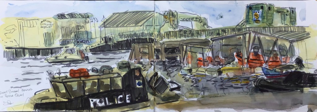A very quick sketch of the old lifting bridge and lifeboat station on Poole Quay yesterday. It was a bit hurried because a couple stopped to talk to me and I lost focus. I do enjoy these spontaneous conversations when I’m painting . People who stop to talk are always positive and enjoy watching what I’m doing, at least that’s what they tell me!