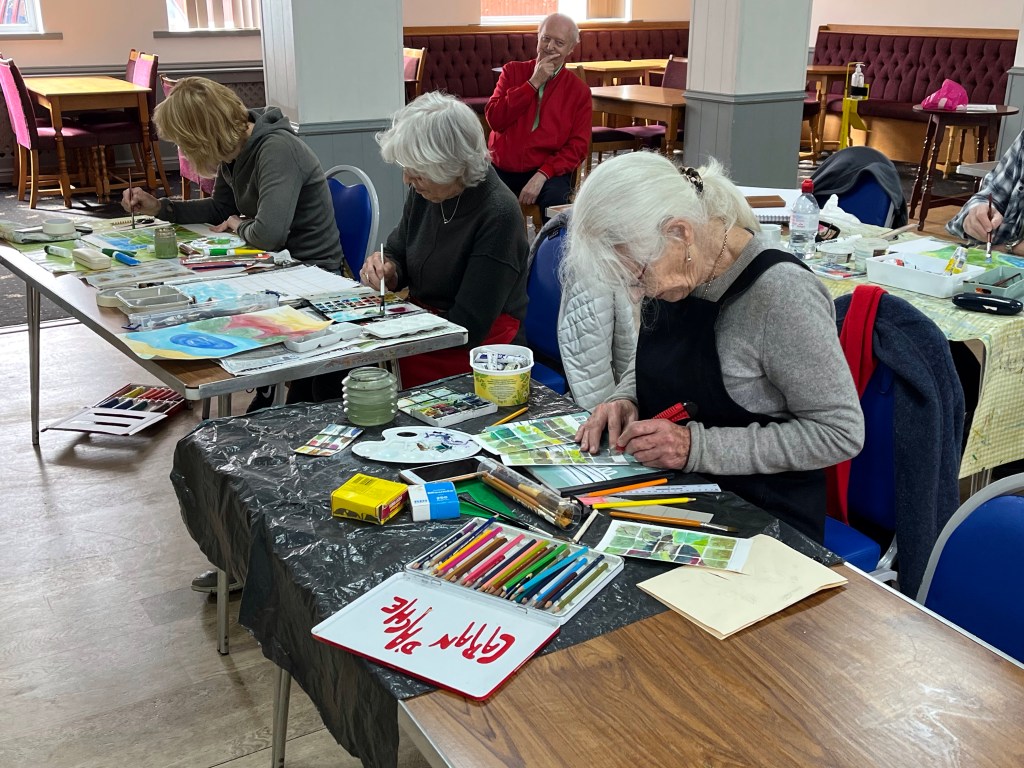 Simon Merry did a wonderful demo on using grids to create paintings during today’s session at Poole Art society . We all had a go and managed to create some interesting work. Sadly there weren’t many members to enjoy it.