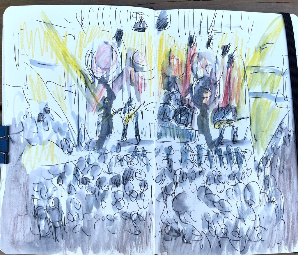 I went to see Nick Mason’s Saucerful of secrets at the Royal Albert Hall last night. A great evening of music and light that took me right back to when I was 17, a few years ago! We had great views from a box right in front of the stage so I tried a couple of sketches. Unfortunately it was much too dark to see what I was doing so they are a little messy. Thanks to Cliff for organising our trip and Mark and Lyndsey for making it special.