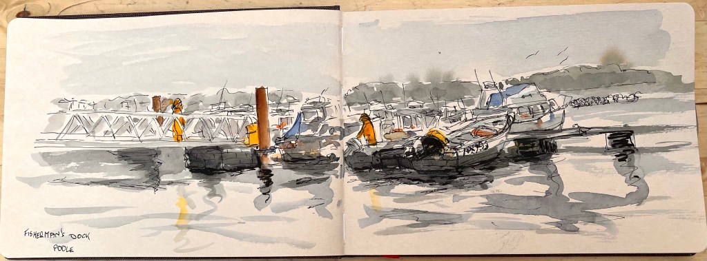 Our plein air painting session didn’t start very well this morning, it was wet and windy on Poole Quay but I managed to find a sheltered spot behind the old lifeboat station and do a couple of quick watercolour sketches. This one is in my new Hahnemuhle toned sketchbook. It’s a lighter weight paper than I am used to but it took a wash without rippling so I am happy with it. Now the sun is shining and it’s hot!
