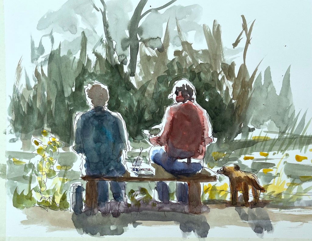 The second painting I did yesterday. When I got back to the river two of the artists were sat painting in the sunshine and I was attracted to the way they were outlined by the strong sunlight.