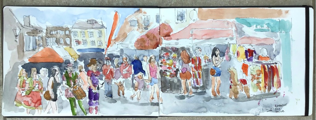 I had a great morning at the Wimborne Folk Festival sketching the busy high street and a couple of the Morris sides, Sarum and Maenads. I was on my way back to the bus stop when I saw this group performing outside Wimborne Minster. The music was good and they were backlit against a dark wall, the bass player wore a purple shirt which was a great contrast to his glowing bass. I couldn’t pass the, by.