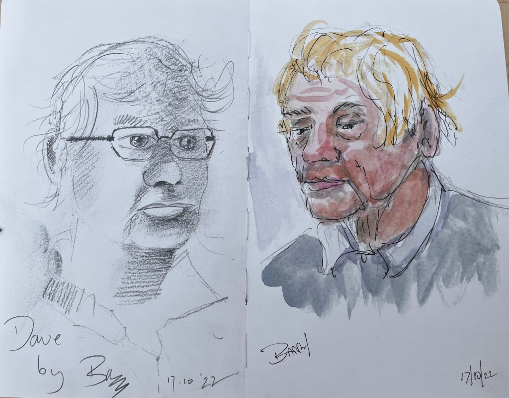 I was stewarding at the gallery this afternoon with Barry. We didn’t have many visitors so I painted a quick portrait of Barry and then he drew me. A productive way to spend a quiet afternoon in an art gallery.