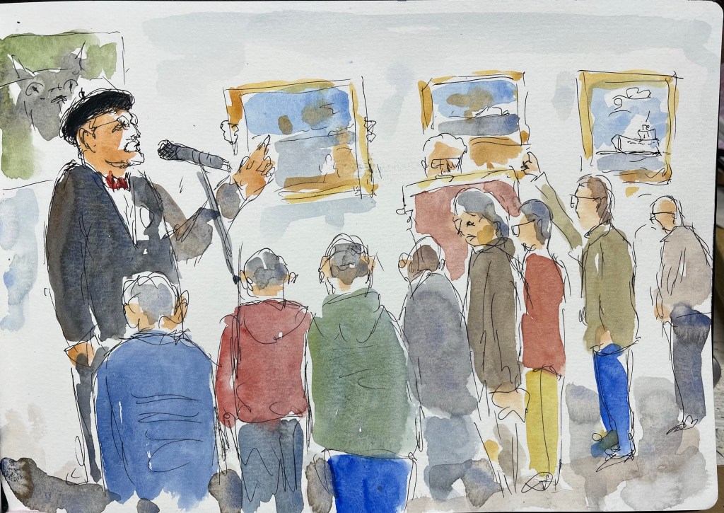 Poole and East Dorset Art Society held an auction of paintings donated by local artists today. The Monet raised went to the Poole charity “Waste not want not“ John and Barry did amazing work as auctioneers ably supported by Pat and a team of PEDAS members. This was the largest painting sold plus a quick sketch of John in action.
