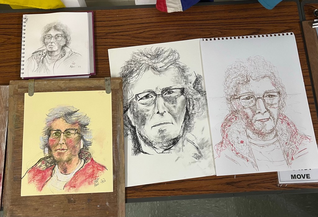We had a really good portrait session at Broadstone Art Society this morning with our guest model Pat. Here is a selection of work from our talented artists.
