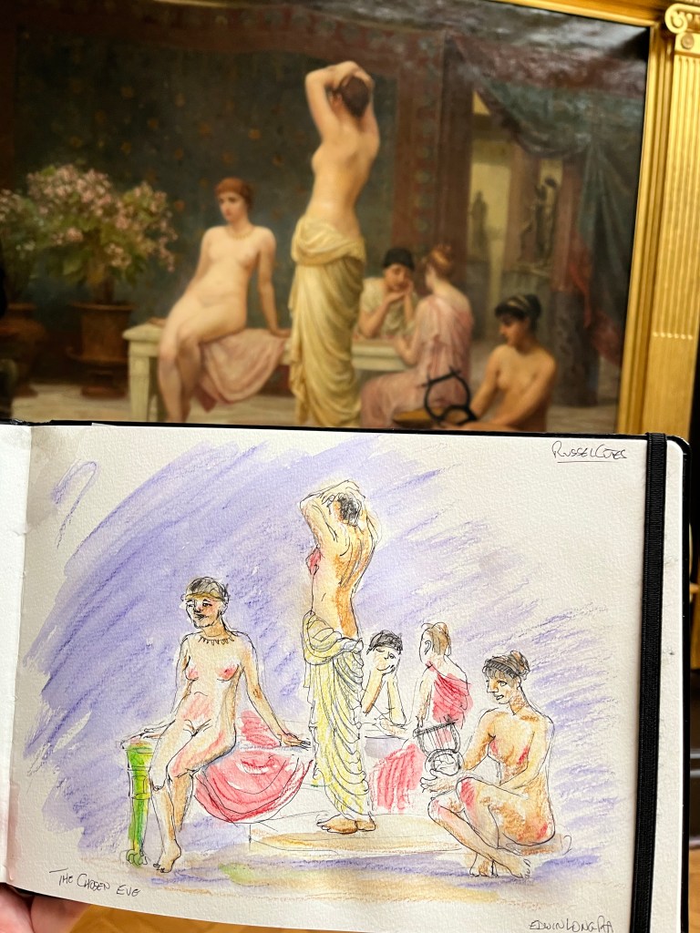 Urban sketchers meeting at the Russel Cotes museum in Bournemouth this morning. I chose a detail from Edwin Longs huge painting “ The chosen five”