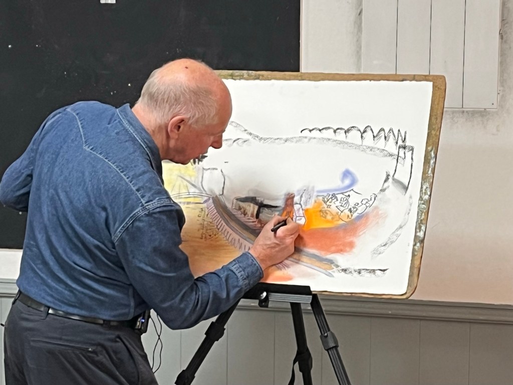 Our demonstrator at PEDAS this afternoon was Tony Kerrins, an artist from Swanage. Tony has published several books on walking and drawing in the Purbeck and created a mixed media painting from memory showing us some of his drawing techniques. A fascinating session from an interesting and creative artist. I couldn’t resist a quick sketch while Tony painted.