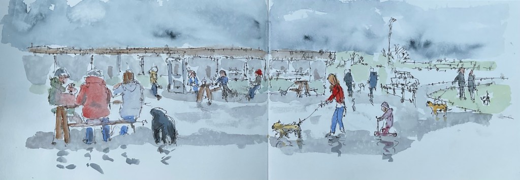 There was a meeting of Bournemouth and Poole urban sketchers this morning. Unfortunately I went to the cafe when I should have been at the visitors centre so I missed everybody. However I did sketch the cafe in the drizzle then walked to the beach when the weather dried up and the sub put in a brief appearance.