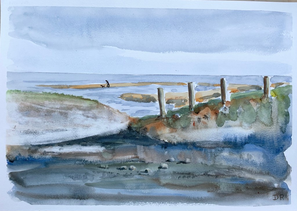 Another painting from our weekend away. This is Charmouth beach at the mouth of the river. Unusually for me I left out the cars and all the people except one dog walker in the distance. I sat in a very cold wind to paint this so it was a bit rushed at the end!