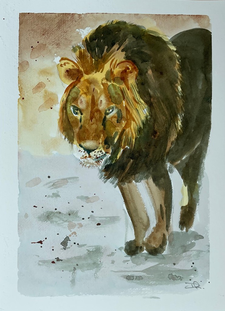 Kalahari Lion from a photo I took. In South Africa. This is only A4 size as I wanted to try it out before doing a larger painting . Watercolour on Jacksons 300gm not.