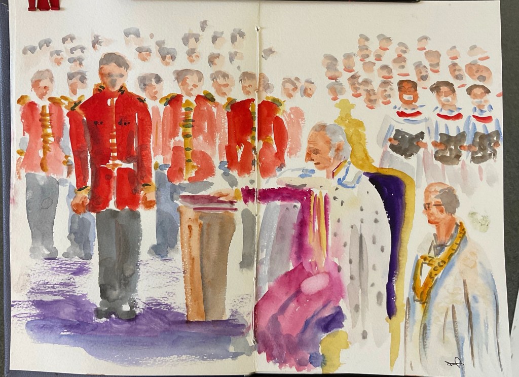 I’m stewarding at the art gallery this morning. It’s 12.30 and I haven’t had a single visitor. The cafe manager just told me there are 10 cars in the car park which is normally full on a Saturday morning, he said five belong to staff, I told him one was mine so that makes four visitors to the park. I watched the coronation service on my iPad while sketching with a paintbrush, it’s a bit messy but the camera angles keep changing!