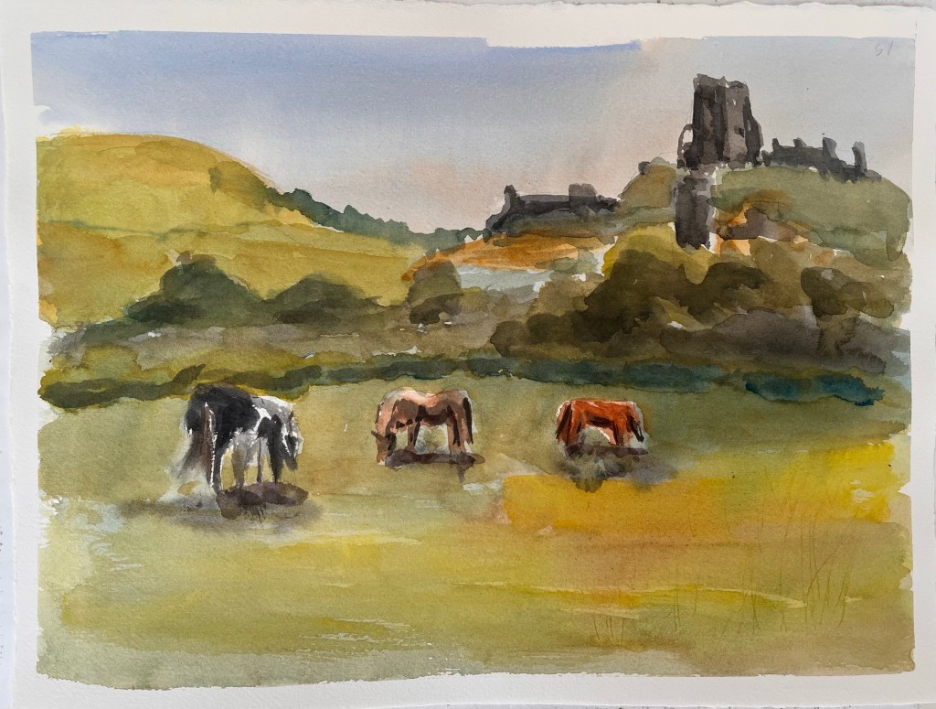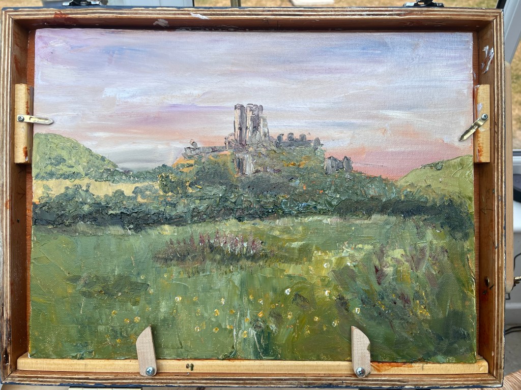 A lovely visit to Corfe Castle this morning with Broadstone Art Society. I havejust finished making a new pochard box so I can paint with oils outdoors so this was a chance to try it out. It worked well although there are a couple of modifications I will make to improve it. My oil painting looks better from a distance so I am happier with the watercolour I painted afterwards.