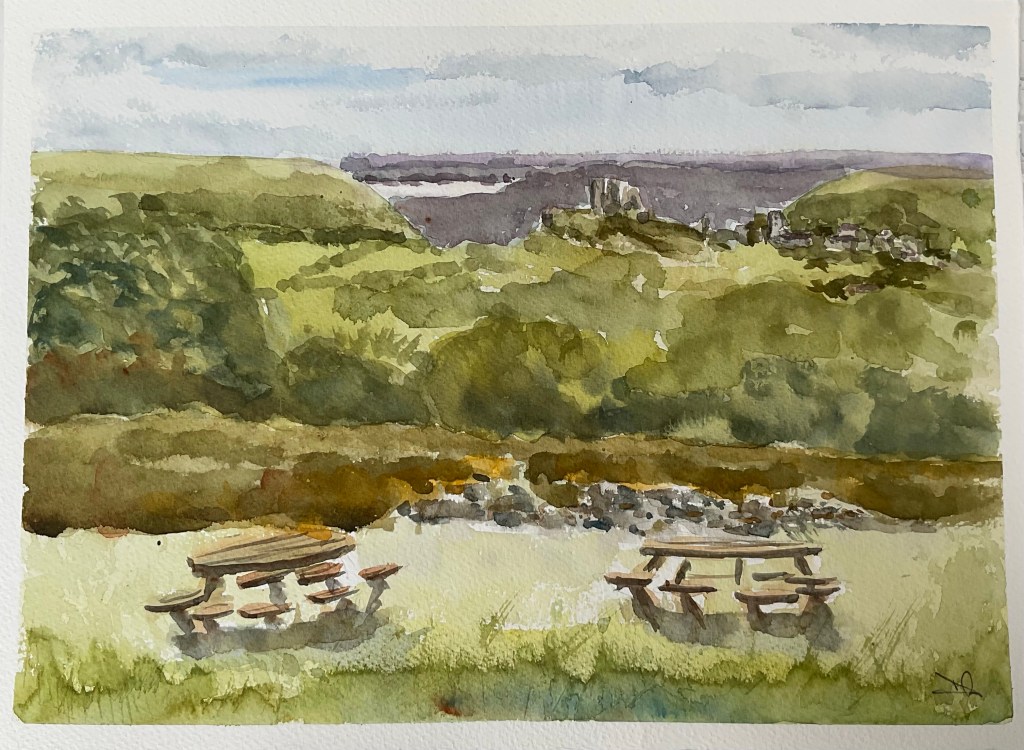 The Scot Arms in Kingston has great views over Corfe Castle and they kindly allowed us to paint from their garden this morning. Eight members of Poole and East Dorset Art Society were joined by professional artist Kate Marr and some of her students for a very sociable painting session.