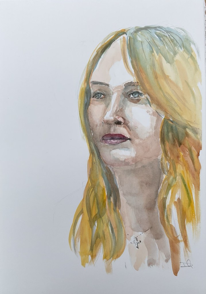 Wendy sat for us at Broadstone Art Society today. I used watercolour on hot pressed paper which is usually used for botanical drawings because it’s extremely smooth. I just like the way the paint behaves which is quite different to the textured watercolour paper.